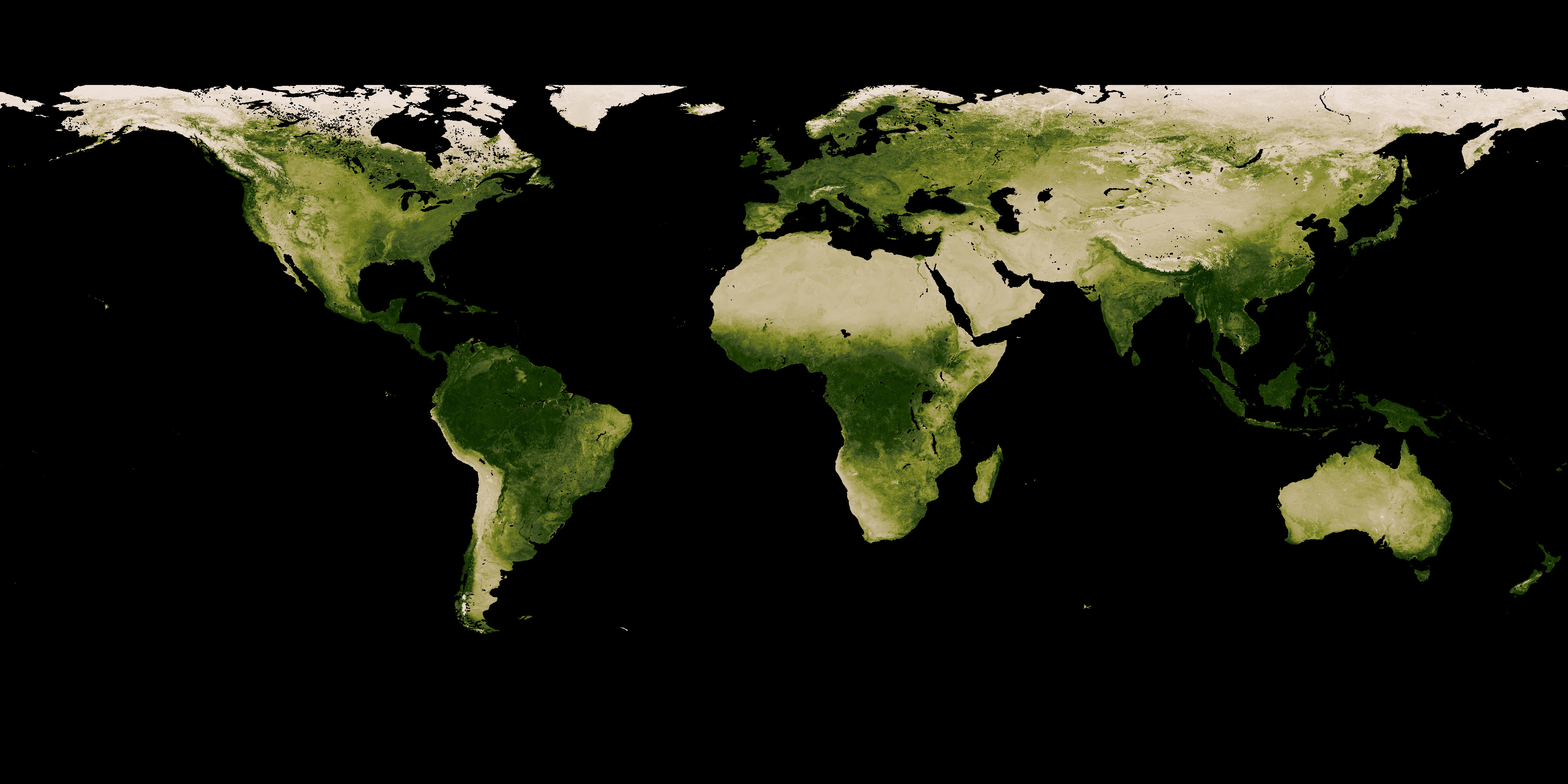 This map shows the density of vegetation around the world. The darkest areas have heavy vegetation coverage, while the lightest areas have virtually none. This data is an aggregate of observations taken over the last month.